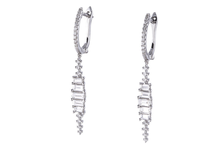 14K white gold with 0.84 carats of baguette diamonds and 0.28 carats of round diamonds.