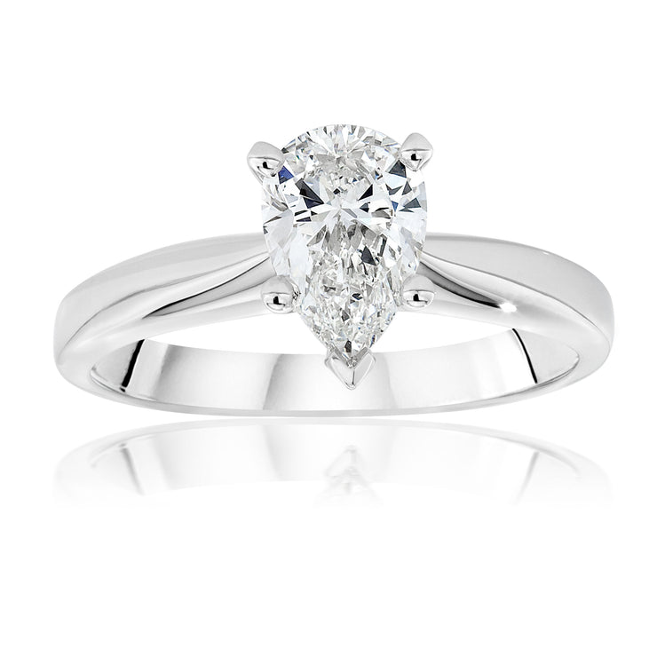 Greis classic solitaire engagment ring with a pear shaped diamond set in center of a platinum medium width band.
