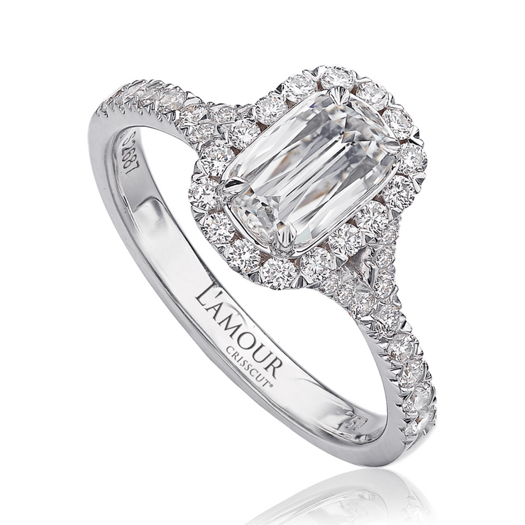 Christopher Designs engagement ring with 0.75ct LAmour Crisscut® diamond center, surrounded by round diamonds 0.43cttw. Halo design ring features pave set split shank with diamonds going half way around the finger.