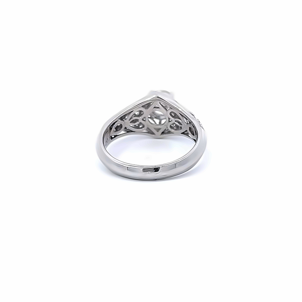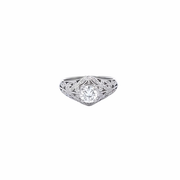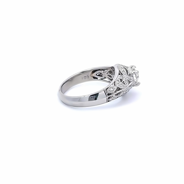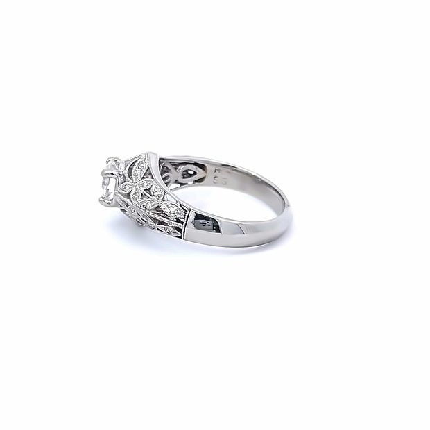 Vintage-inspired Simon G. engagement ring crafted in platinum and adorned with 0.82 carats of sparkling diamonds.