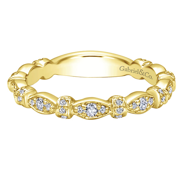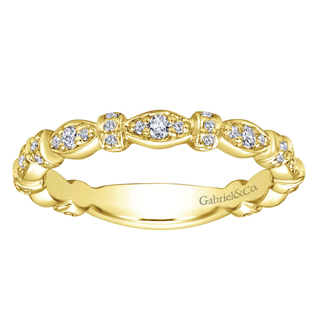 This yellow gold band form a modern style band set with .33 ctw of striking round cut white diamond accents. Perfect for stacking.
