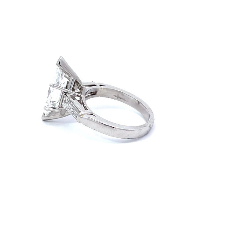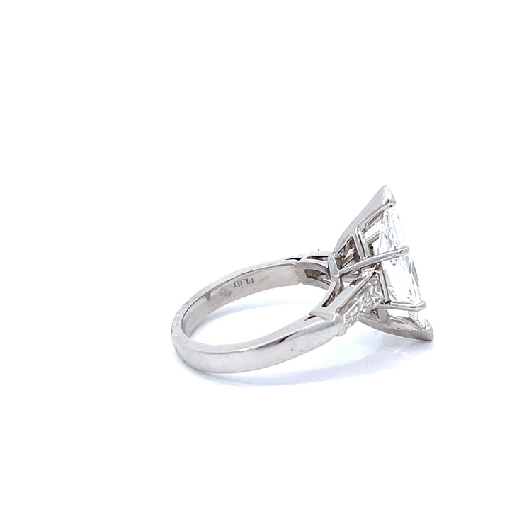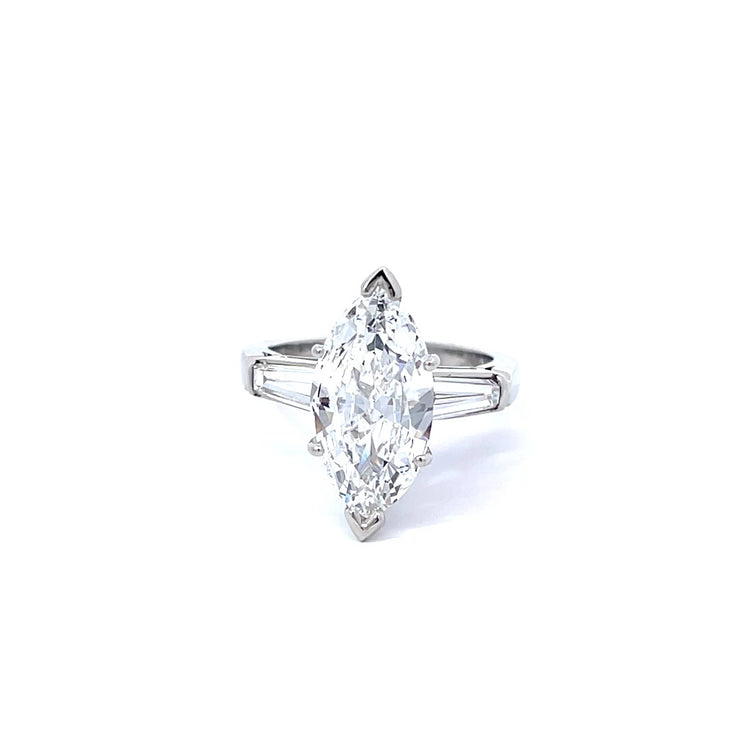 This is a stunning 3.54 carat marquis cut diamond with two tapered baguette cut diamonds in a platinum setting.