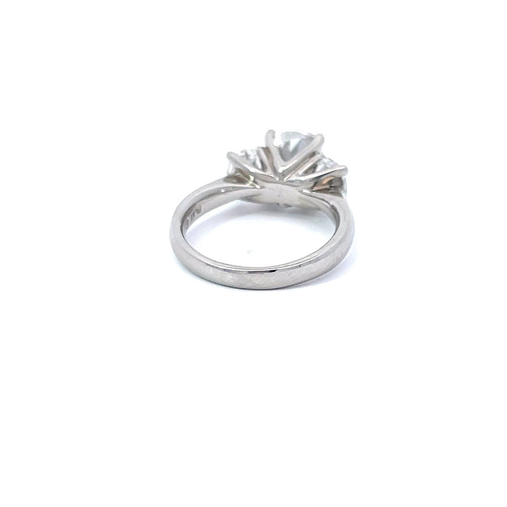Three gorgeous oval diamonds in a platinum setting. The center diamond is 3.01 carats and the side diamonds total 1.33 carats.