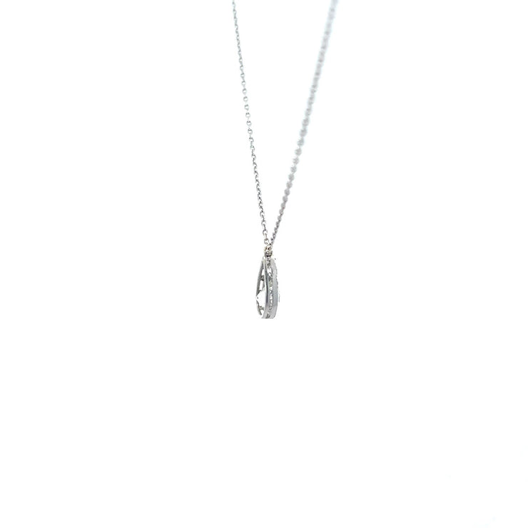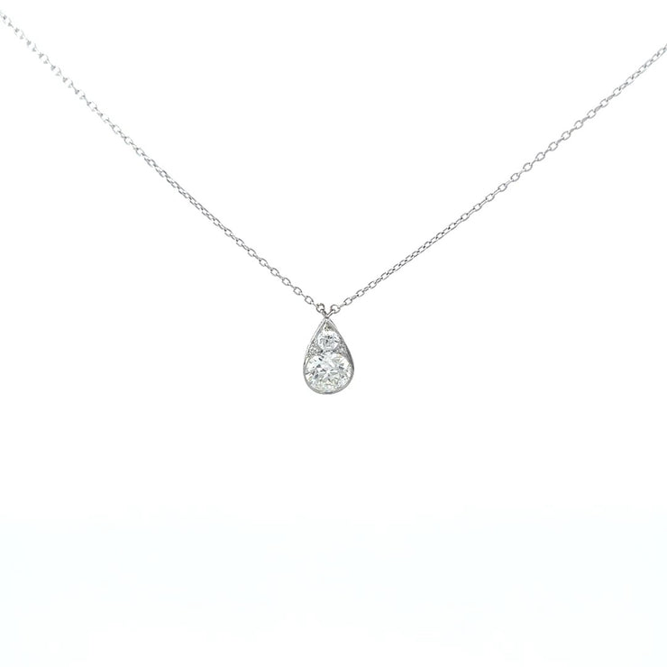 14K White gold chain with a pear shaped pendant containing 2 Euro-cut diamonds.