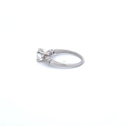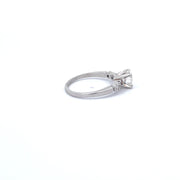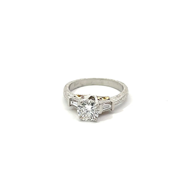 18K white gold with a 0.83 carat center diamond, flanked by 2 baguettes weighing 0.20 carats.