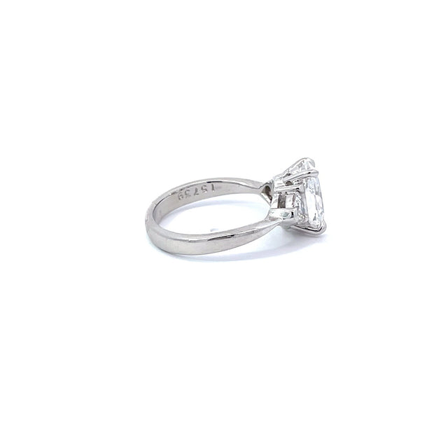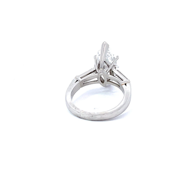 This is a stunning 3.54 carat marquis cut diamond with two tapered baguette cut diamonds in a platinum setting.