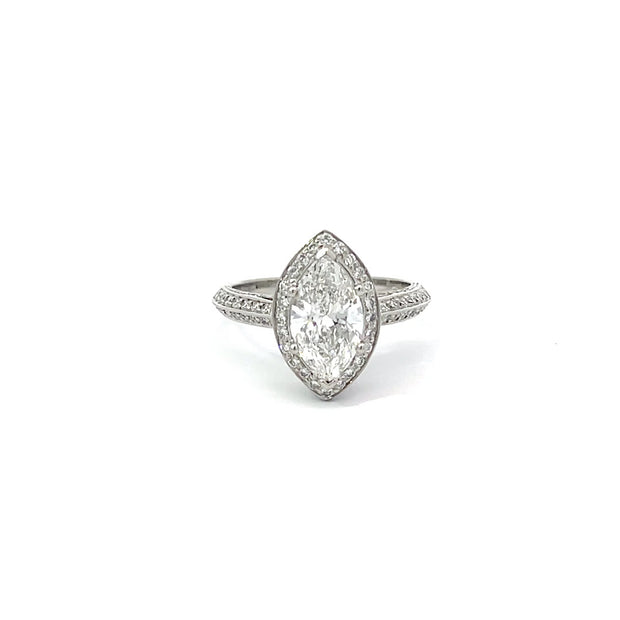 This is a 1.66 carat, GIA certified marquis cut diamond, in a platinum setting, that has 0.75 of micropave` diamonds.