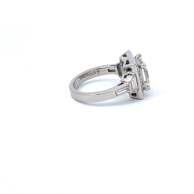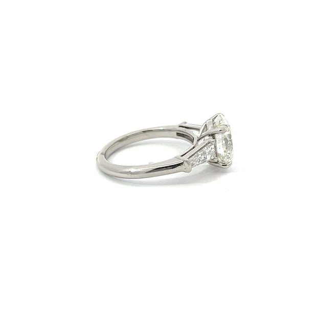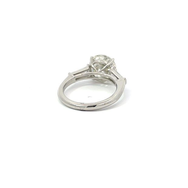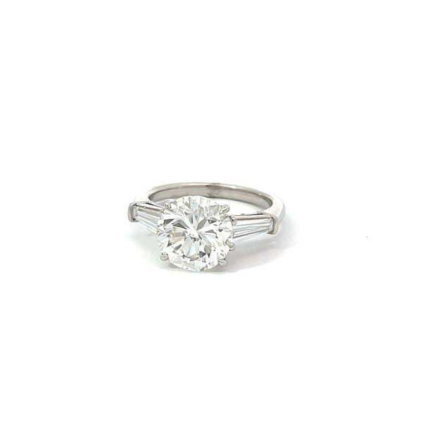 A four carat round brilliant cut diamond flanked by 2 tapered baguettes in a platinum setting.