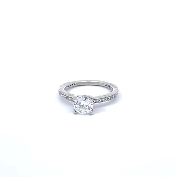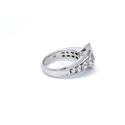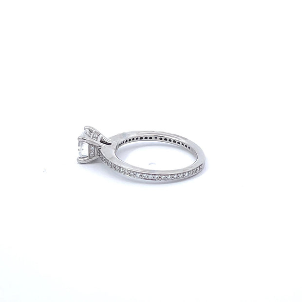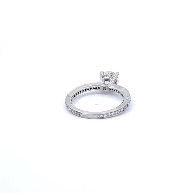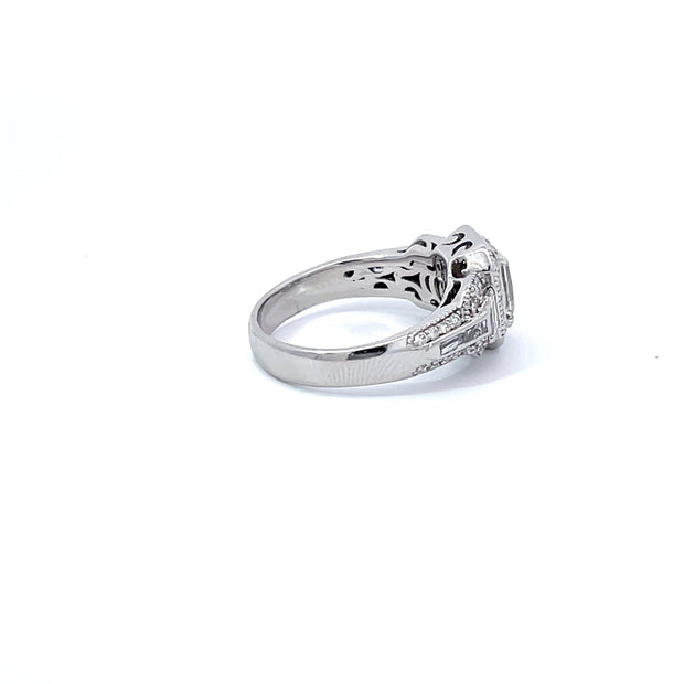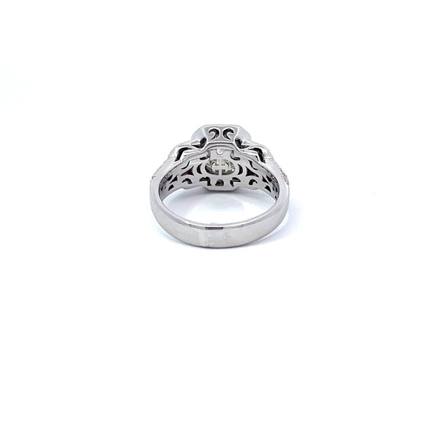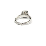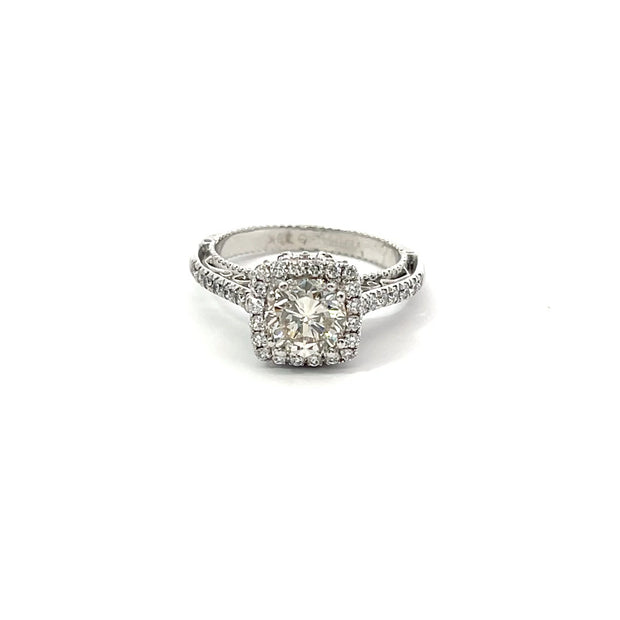 An 18K white gold ring by Verragio. This piece is made of 18K white gold, with a 1.30 carat diamond center stone, with an additioanl 0.60 carats of diamonds in the setting.