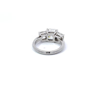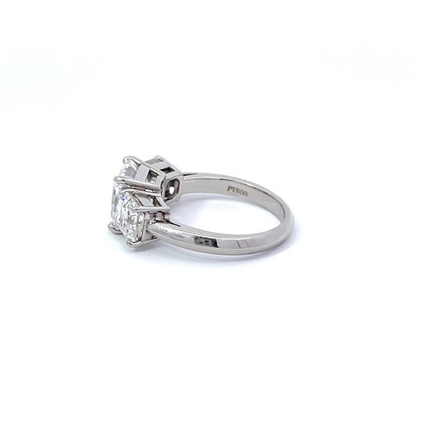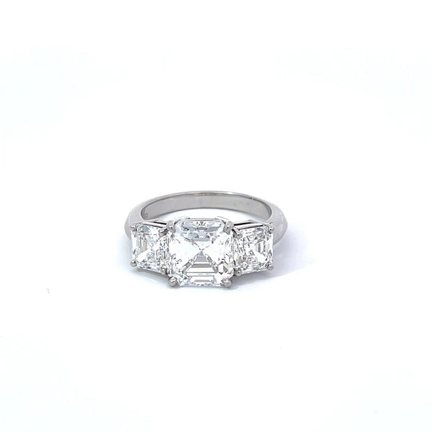This stunning ring contains one 3.02 E/VS1 Asscher cut diamond flanked by 2 smaller Asscher cuts weighing 1.00 carat G/VS2,1.00 carat G/VVS1