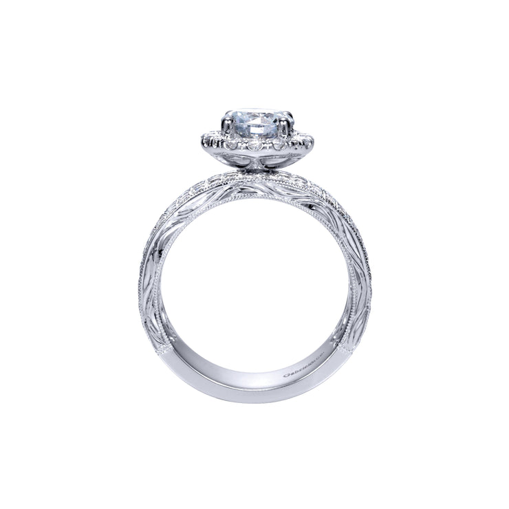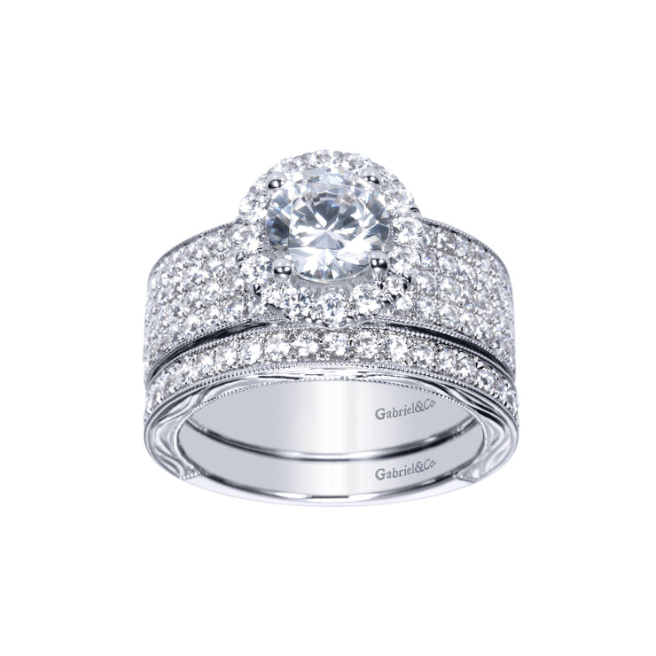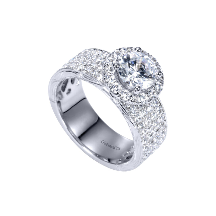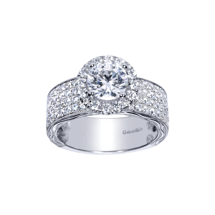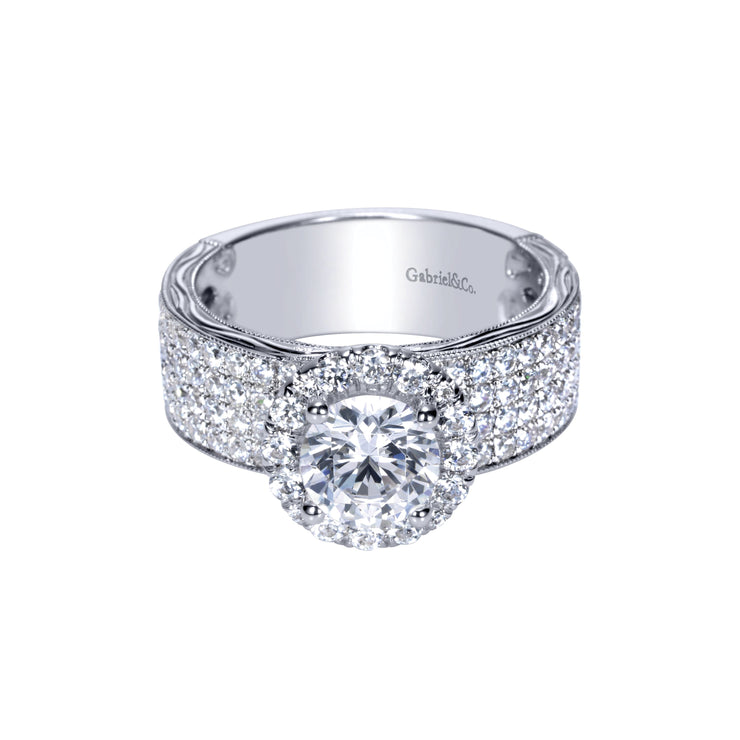 Wide pave` diamond shank engagement ring with a halo around the center stone.