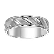 Mens wedding band with diagonal cuts, bright and satin finish with milgrain accent and round edges with flat profile