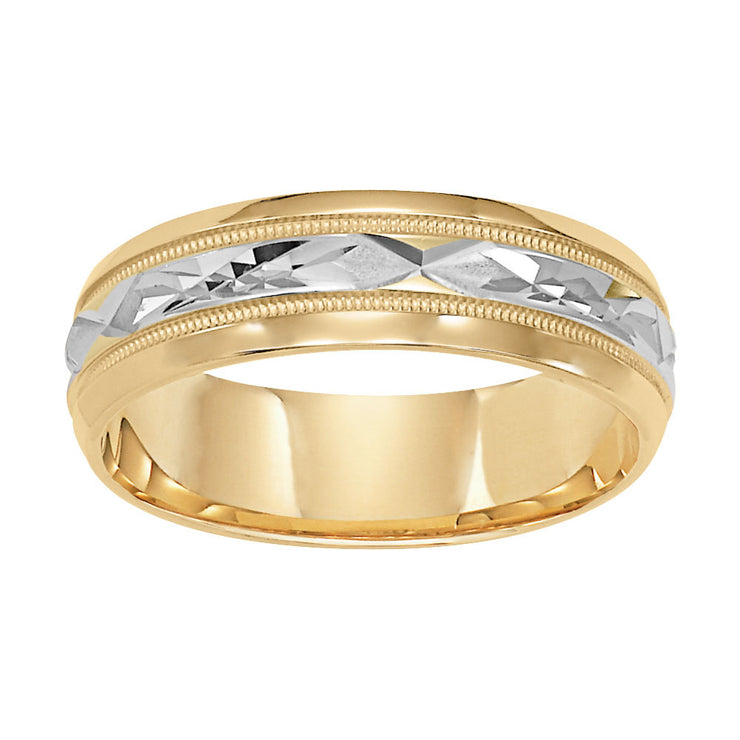 Men's wedding band with diamond cut engraved finish, milgrain accent with bevel edges low dome profile