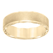 Mens wedding band with ultra satin finish bevel edge, side swiss cuts treatment and flat profile.