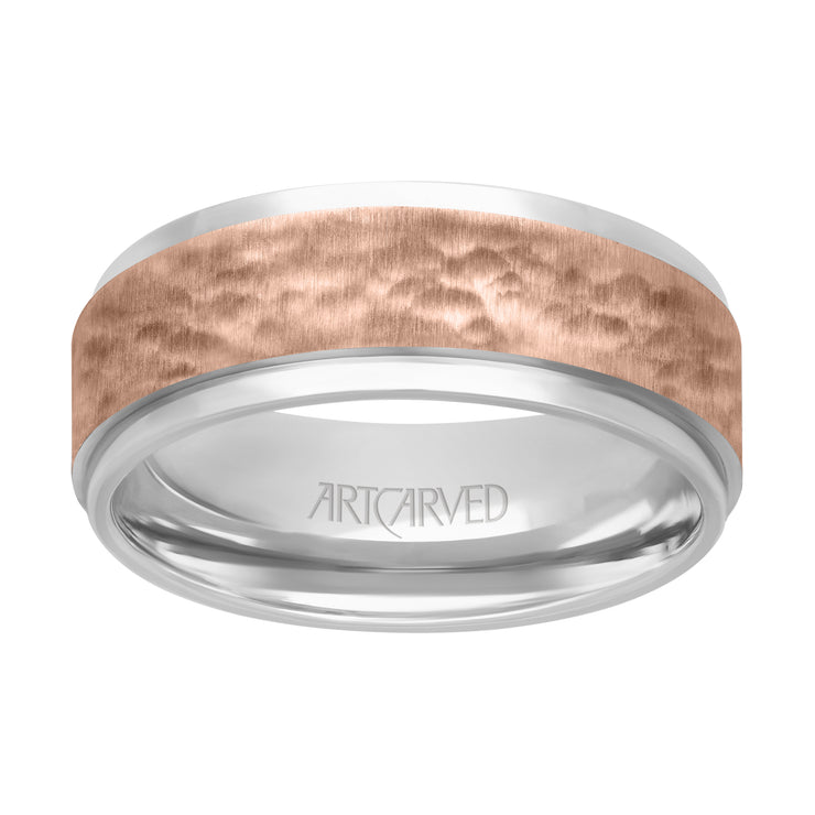 Comfort Fit wedding band with brushed hammered finish and bright flat edges Please note hand hammered styles will have slight variations due to the nature of the manufacturing process