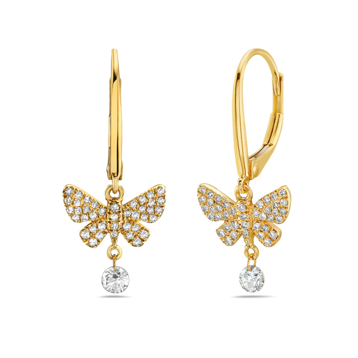14K yellow gold diamond pave' butterflies, each with a single diamond drop.
